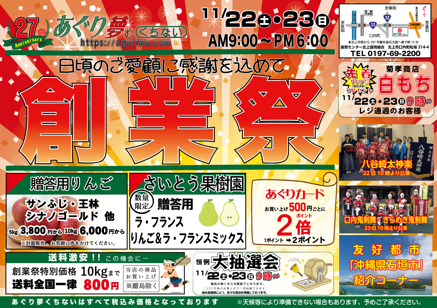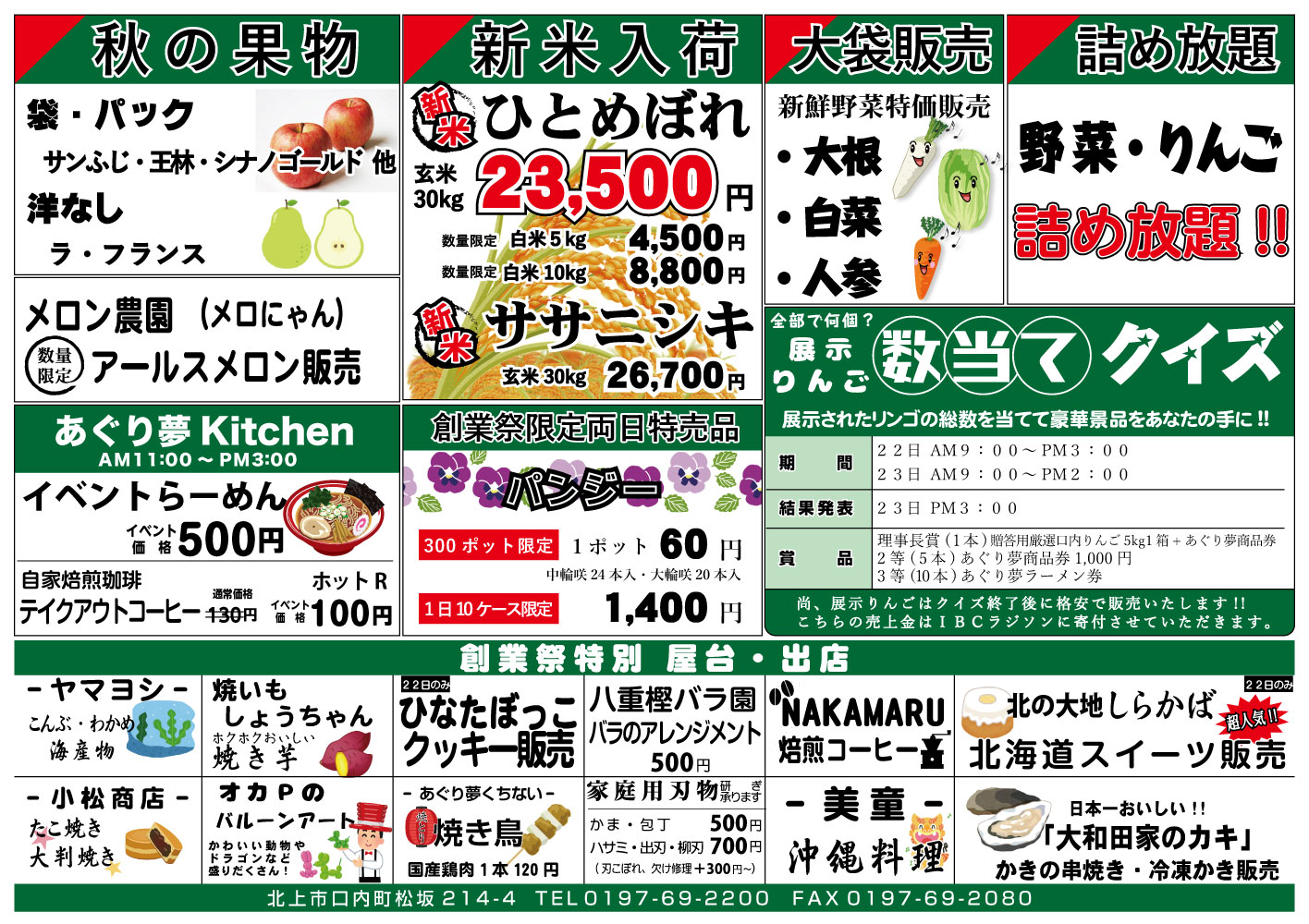 Slide OneSlide ThreeSlide Two 夏季営業時間(4月1日~11月30日) AM9:00~PM6:00 冬季営業時間(12月1日~3月31日) AM9:00~PM5:30 最新のチラシ 過去のチラシ一覧 最新情報 《秋の味覚》りんごや柿、その他の果物・野菜販売中!!